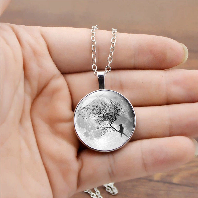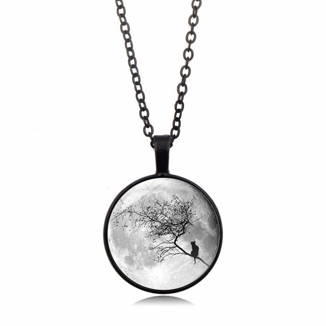 This beautiful gray moon neckpiece is goth-inspired and designed to make a statement. It is made of zinc alloy and glass.